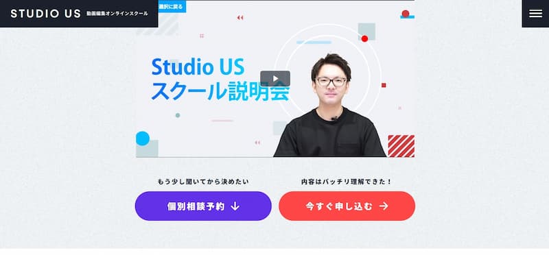 studio USは、動画編集を学びたい人のために設計されたオンライン専門スクールです。カリキュラムは、YouTube動画の編集から企業向けPR動画、SNS広告の動画まで、幅広いジャンルを網羅しています。