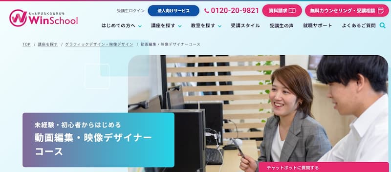 Winスクールは全国展開する実績豊富なパソコンスクールで、名古屋駅前校と栄校があり通学に便利です。個人レッスン形式で、Premiere ProやAfter Effectsを基礎から実務レベルまで学べます。