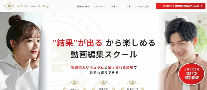 AIMクリエイターズカレッジは半年以内の目標達成率88%を誇る結果にコミットした動画編集スクールです。YouTube動画編集に特化し、編集スキルだけでなく営業やクライアントワークまで学べます。