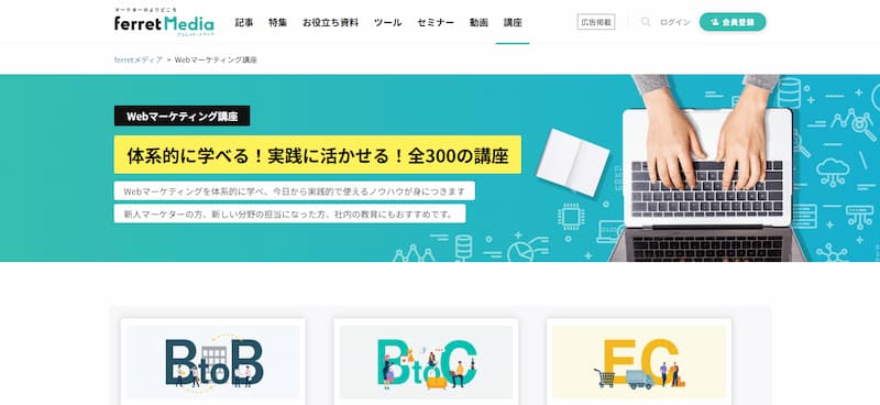 ferret Webマーケティング講座は、登録会員数37万人、月間430万PVを誇る国内最大級のWebマーケティングメディアが提供する学習プラットフォームです。Twitter Japan、LINE、ピンタレストジャパンなど有名企業が監修しています。