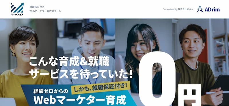 マーケジョブは、デジタルマーケティング支援会社ADrimが監修する、完全無料の転職支援型スクールです。受講者には年間60,500円相当の学習プラットフォーム「ADrim Marketing Workout」が無償で提供されます。