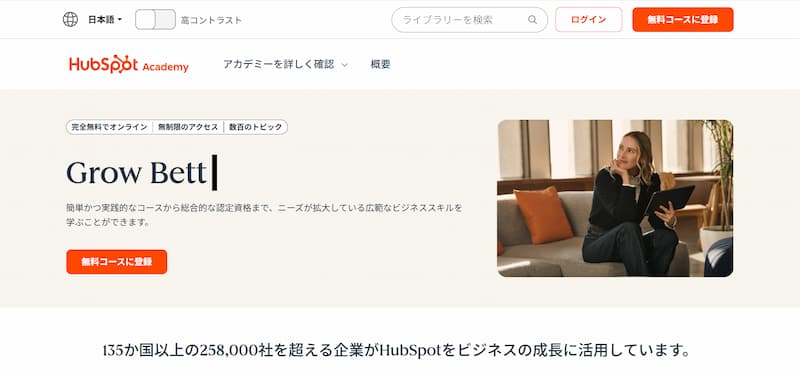 HubSpotアカデミーは、マーケティングやセールス、カスタマーサポート担当者向けに完全無料でトレーニングを提供するオンライン学習プラットフォームです。世界で25万人以上が認定資格を取得している実績があります。