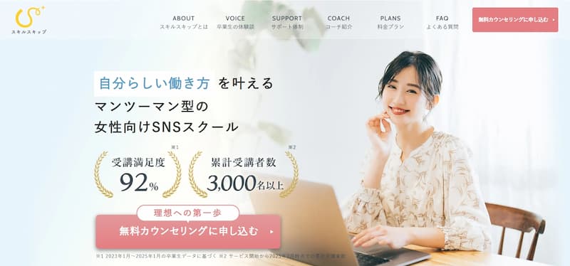 月1回のコーチングや特別イベント、コミュニティでの交流など手厚いサポート体制が整っており、副業や転職を目指す女性に最適です。経済産業省のリスキリング支援事業対象で最大70%の受講料還元も受けられるため、コストパフォーマンスにも優れています。
