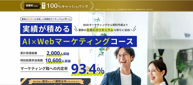 最大6ヶ月のサポート期間と補講受け放題、経済産業省のリスキリング補助金で受講料最大100%還元も可能です。マーケティング職への内定率93.4%という高い実績を誇ります。
