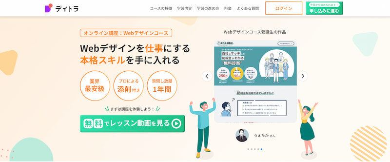 | 学べるスキル | Figma、Illustrator、Photoshop、Webデザイン、LPデザイン、バナー制作、UI/UXなど |