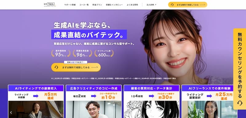 バイテックでは、副業やフリーランスなど、仕事獲得につながるAIスキルを学べます。