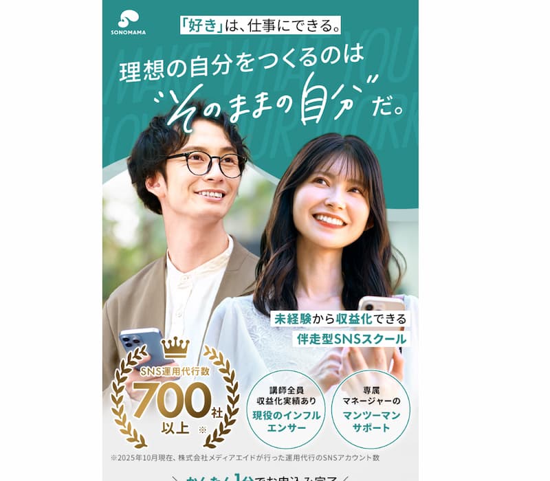 SONOMAMAは講師全員が、現役のインフルエンサーであるSNSスクールです。専属マネージャーによるマンツーマンサポートがあり、未経験からでも確実にSNSのスキルを身につけられます。
